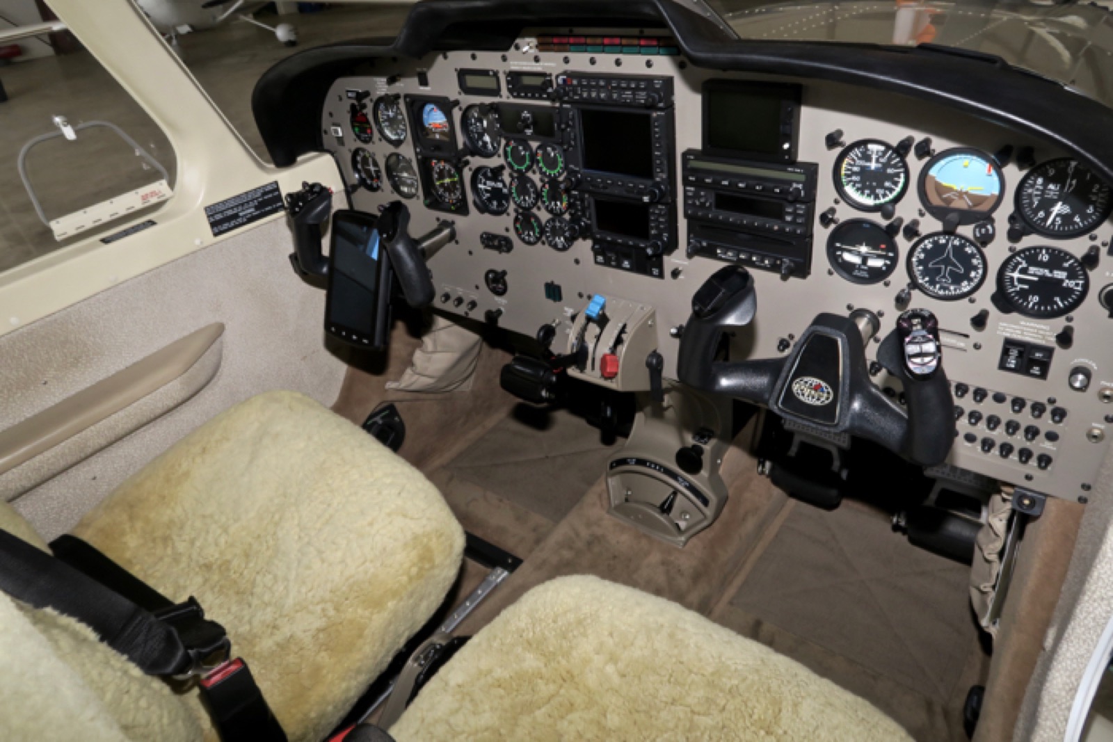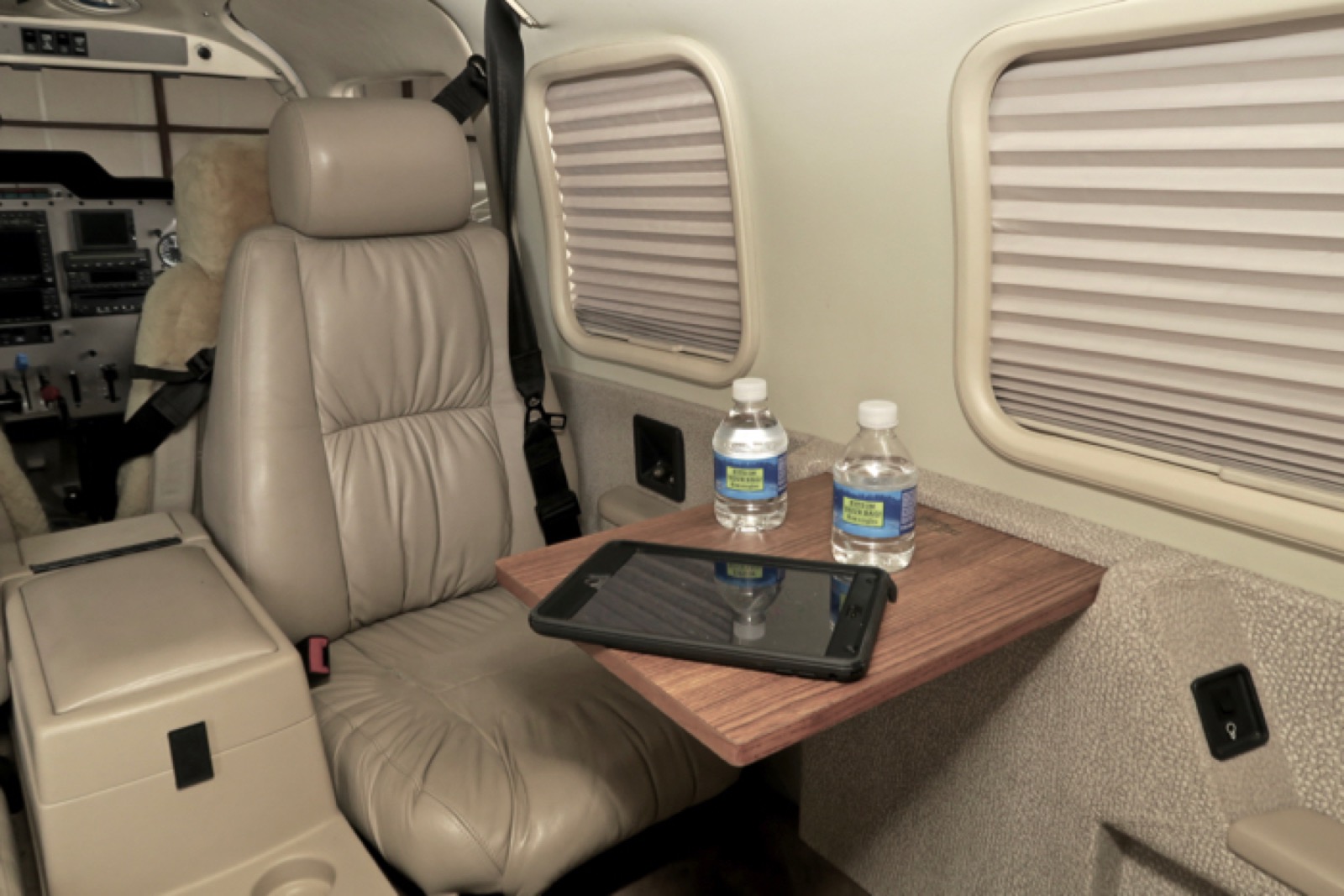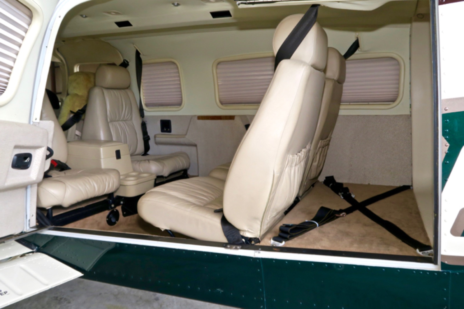 Executive 6-place Interior: Sheepskin Crew Seat Covers Taupe Leather Club Seating Cabin Seat Shoulder Harnesses Club Seating with Writing Table Tan Carpets Baggage tie down straps