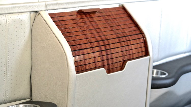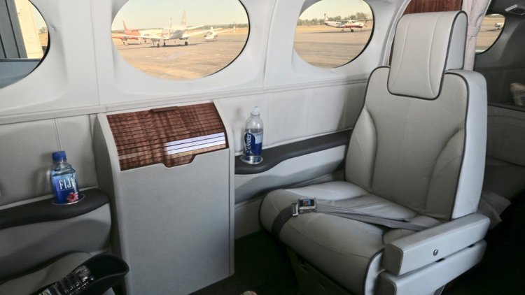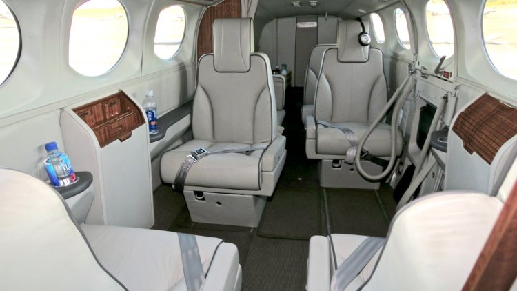 Beautiful 8-Place Executive Interior completed by Eagle Aviation - Light French Gray Leather Seats - Slate Carpets - Wood Veneer Side Tables and Cabin Partitions - Belted Potty Seat with Privacy Cabin Curtains